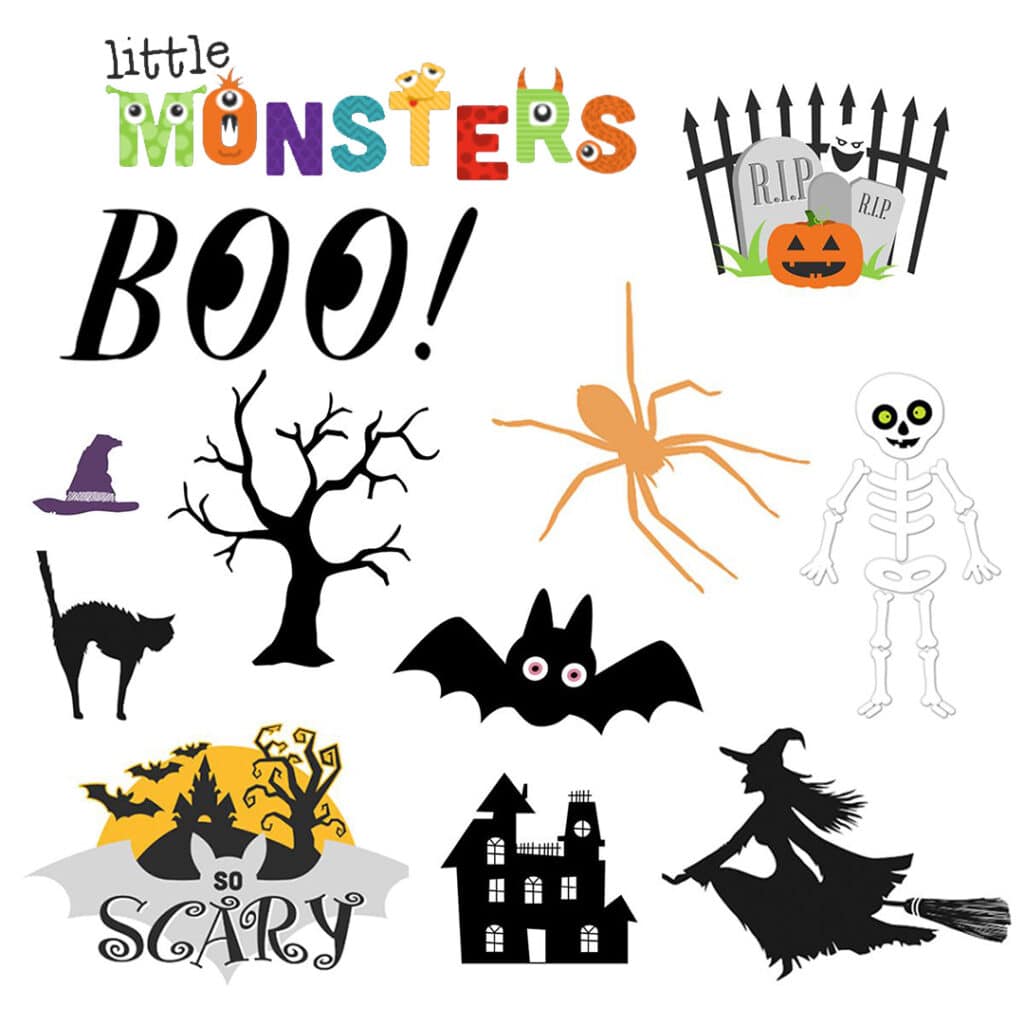 All featured embellishments can be found in the Halloween folder.Â