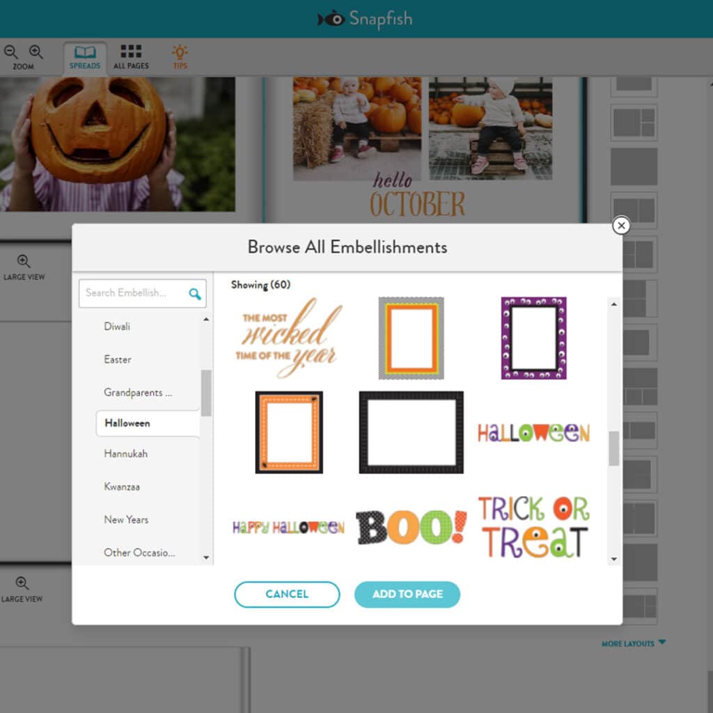 To find Halloween embellishments, click on ‘Embellishments’ > ‘Special Occasions’ > ‘Halloween‘.