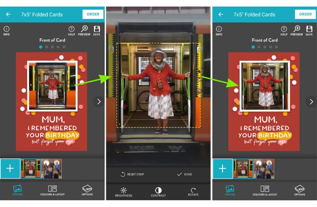 Click ‘Get Photos’ to upload the photos on your device you would like to use to customise the card. You will also be able to change/add text to the inside of the card. (If your chosen card design doesn’t feature any photos, you can go straight to adding your own text to the outside and inside of the card.)