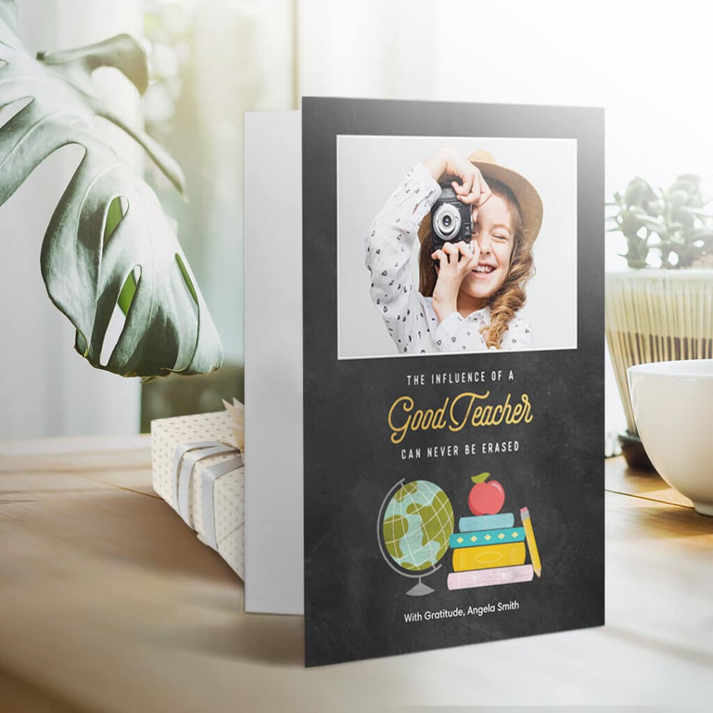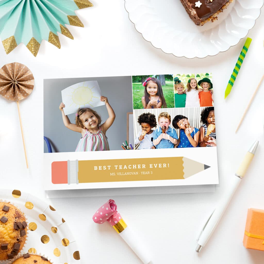 Taking some time to say thank you can mean a lot to these education heroes, so why not surprise them with a creative personalised thank you teacher card before term ends? Whether you’re writing a teacher appreciation card on behalf of your child, or sending it to your favourite teacher at school, college or university, we have something for all. From personalised teacher cards to cards which will tell them that you think they are the absolute best – these unique designs, that you can customise, will make it easy to show them the love they deserve.